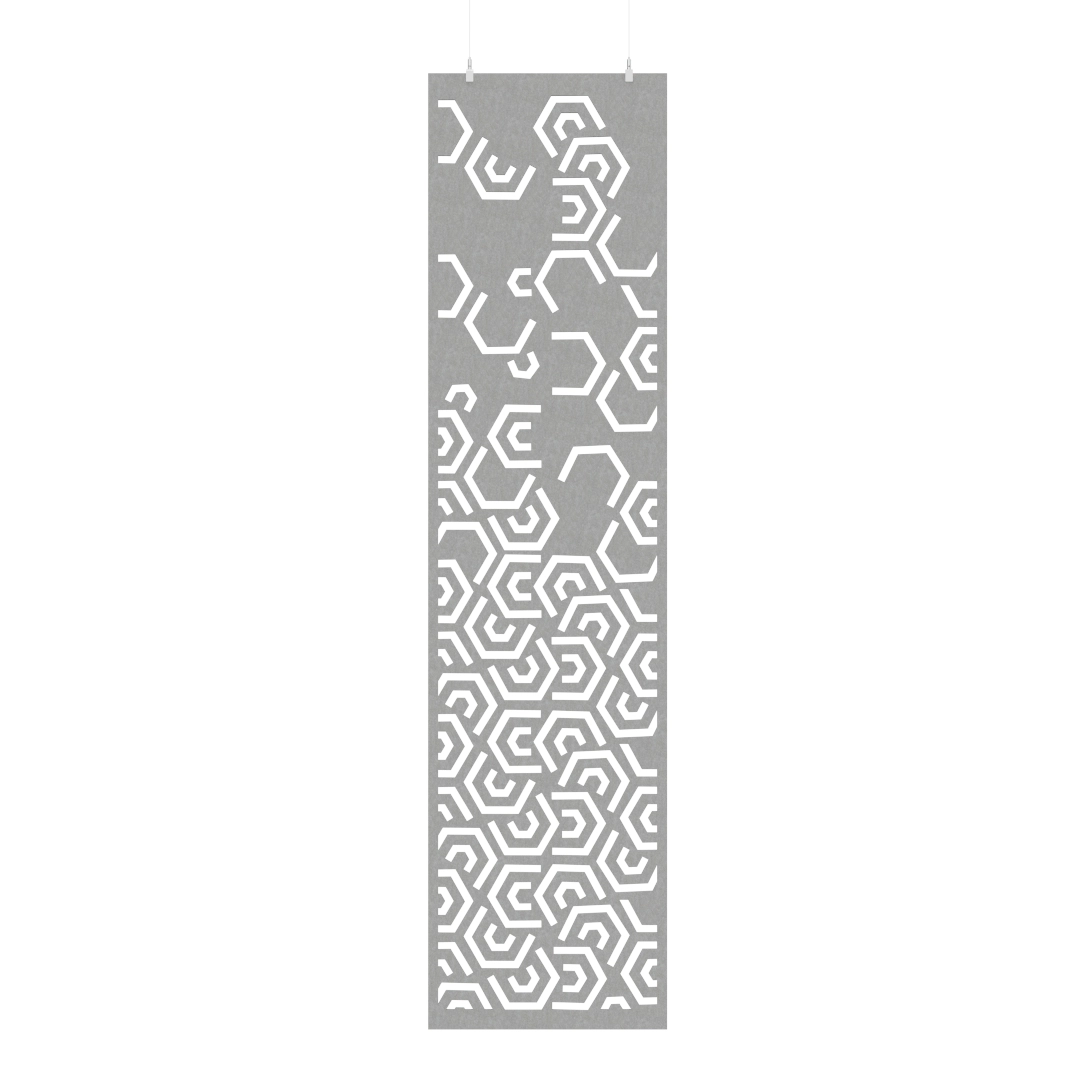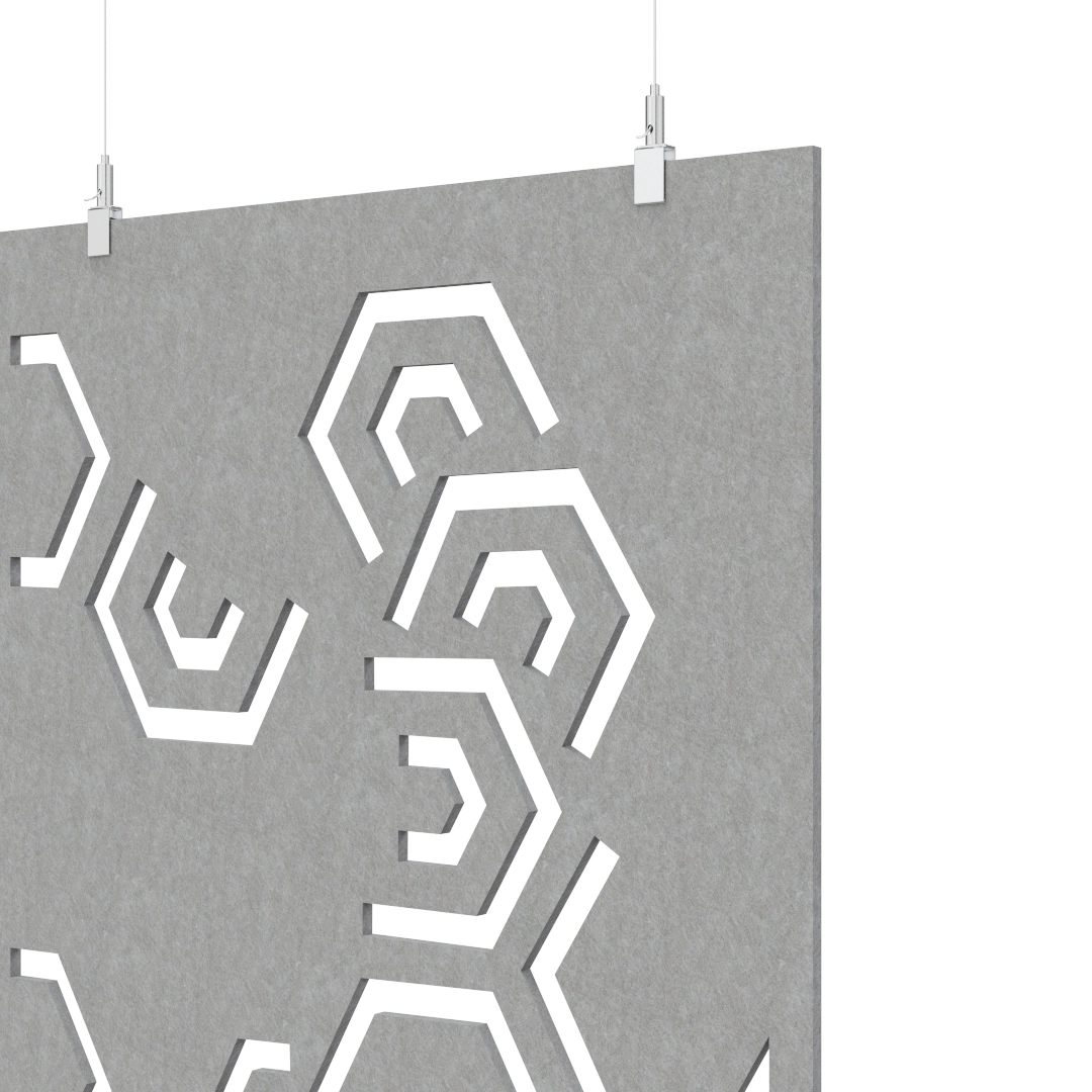 El divisor acústico HEXAGONAL fabricado en fieltro PET, presenta un patrón de figuras geométricas que varían de tamaño y disposición, generando una composición envolvente. Su diseño suspendido aporta dinamismo y profundidad al espacio, equilibrando confort acústico, luminosidad y conexión entre ambientes.